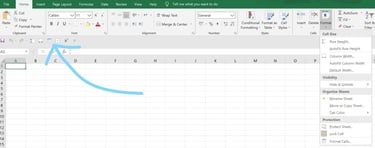 First, you may want to customize your Quick Access Toolbar (QAT) by adding these command icons to it: (Row Height, Column Width, All Borders, and Superscript). These shortcuts will make it easier for you to format your puzzle. The QAT is usually set above the toolbars, so I reposition it below, right above the Name Box and Formula Bar, like so:
