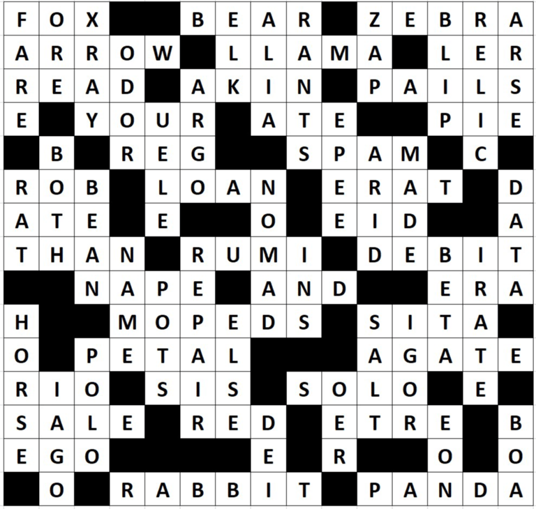 Work on the rest of the squares, making sure that words have at least three letters. If you get stumped, just blacken the problematic squares and move on. This is what I came up with:
