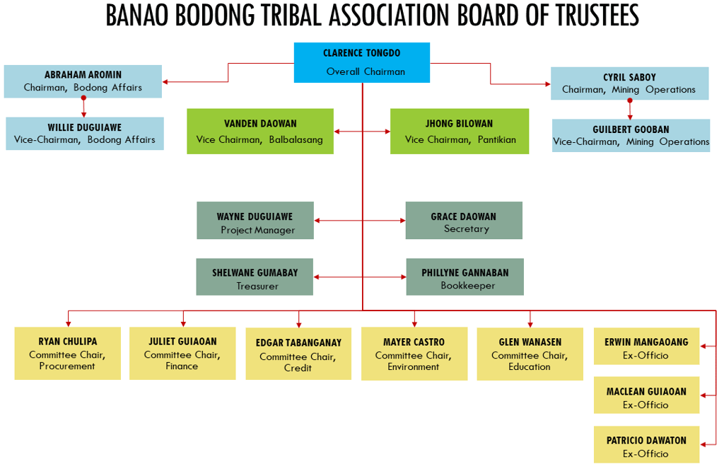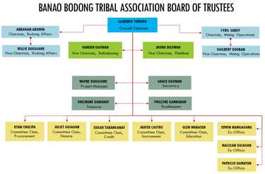 N.B.: This organogram is not the official BBTA BoT organizational chart, but my visualization of the list of officers sent to me by BoT/BBTA Secretary Grace Daowan and with corrections from BoT/Mining Affairs Chair Cyril Saboy. Corrections are welcome. - sms