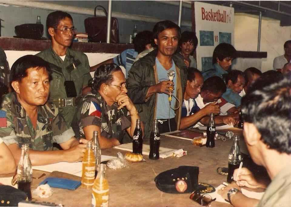 Balweg at the center of the negotiations with the military in the St. Williams Academy gymnasium in Tabuk, Kalinga ca. 1986. To his right are Kalinga pangat (tribal chiefs) Gus Saboy and Ama Yag-ao. Photo by Romulo Tangbawan