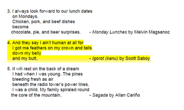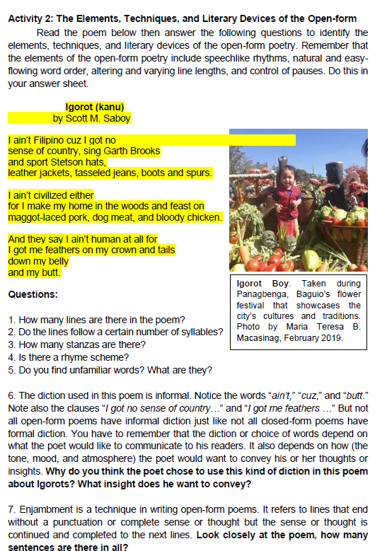 Igorot writer and educator Mel Magsanoc uses "Igorot (Kanu)" and "Minak" as illustrative poems for literary analysis in his instructional materials. Download the modules @ COURSEHERO.